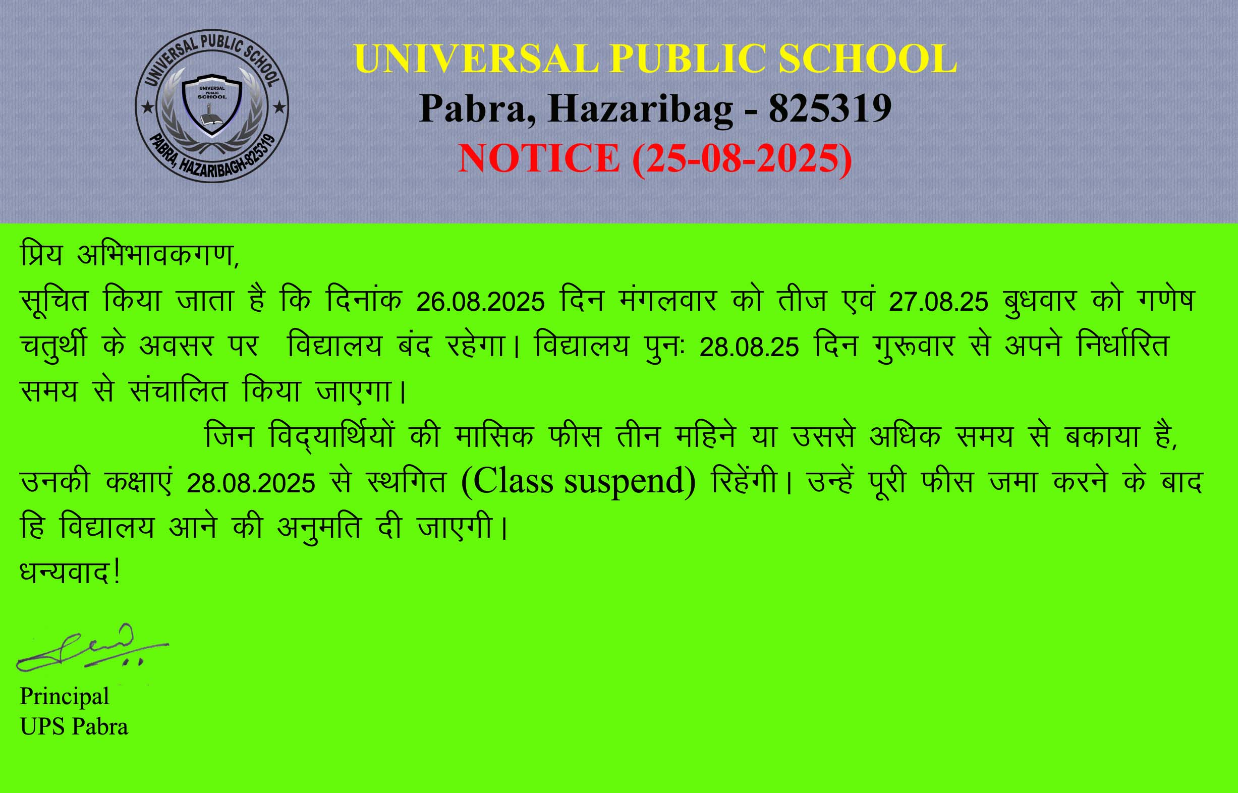UNIVERSAL PUBLIC SCHOOL is committed to impart quality education giving importance to each and every child, cultivating good virtue, values, life skills, ancient culture in a spiritual environment. The school also takes initiative to promote girl child education and stretches her hand for the bright learners with maximum concession on school fees.
